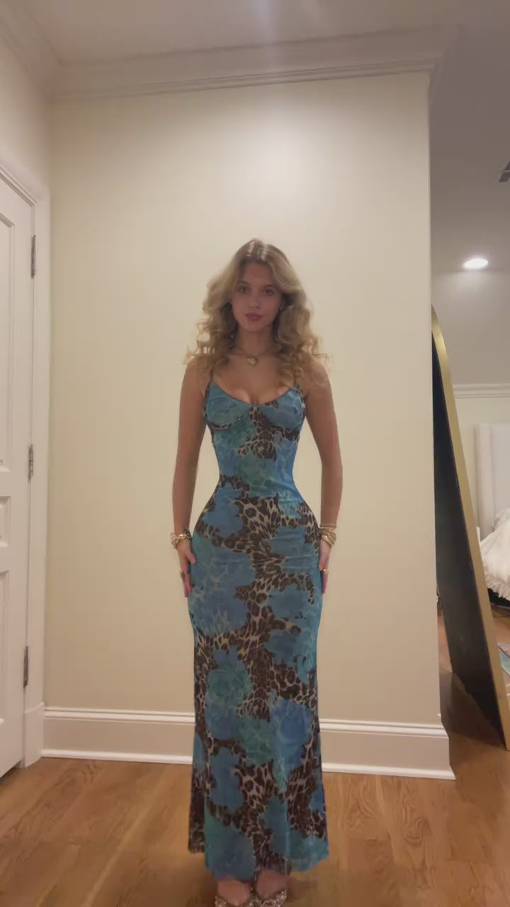 Imprimé audacieux mêlant fleurs bleues et touches léopard