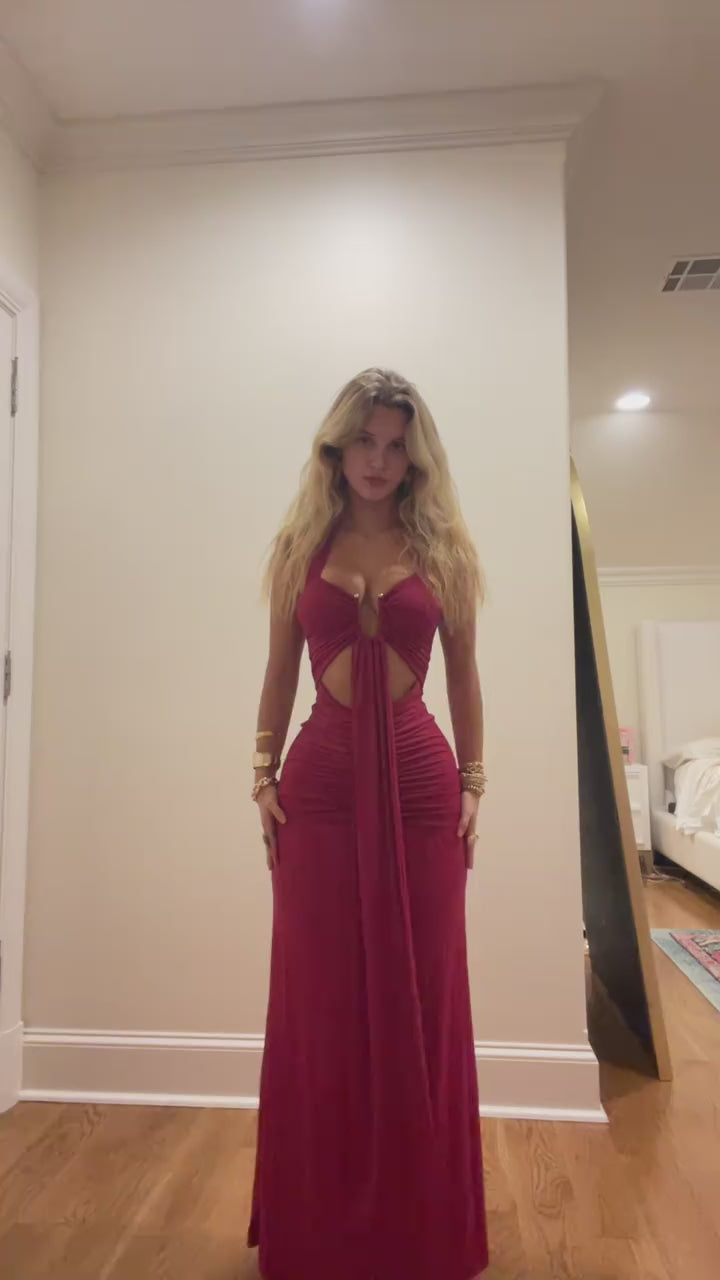 Robe longue et élégante avec un décolleté audacieux et des découpes sur les côtés qui apportent une touche moderne et sexy.